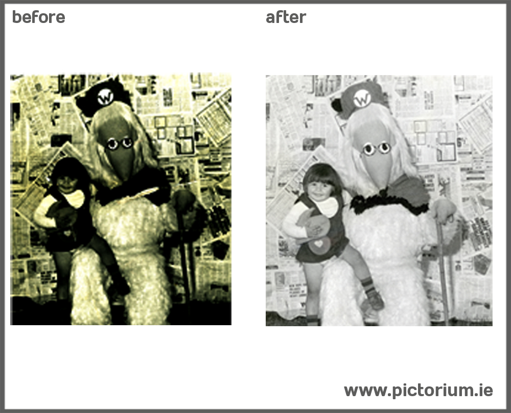 DUBLIN PHOTO RESTORATION SERVICES Discoloured and Damaged Wombles of Wimbledon Photo. This is one photo you will not want to forget! It was badly discoloured. I rebalanced the colors and converted to black and white. This photo was then printed. We also restore very badly damaged photos, restoring faces, body and backgrounds. We restore photographs – restore, repair and renew your scratched, torn, faded or damaged photos. From 15 euro. Free consultation! Your photographs expertly edited & retouched @ The Pictorium Photoshop Monkstown Dublin. Amazing reviews. We work with customers Nationwide. Shop in Monkstown Minutes from Foxrock, Killiney, Glenageary, Deansgrange, Corneslcourt, Blackrock & Dun Laoghaire (01) 2846106